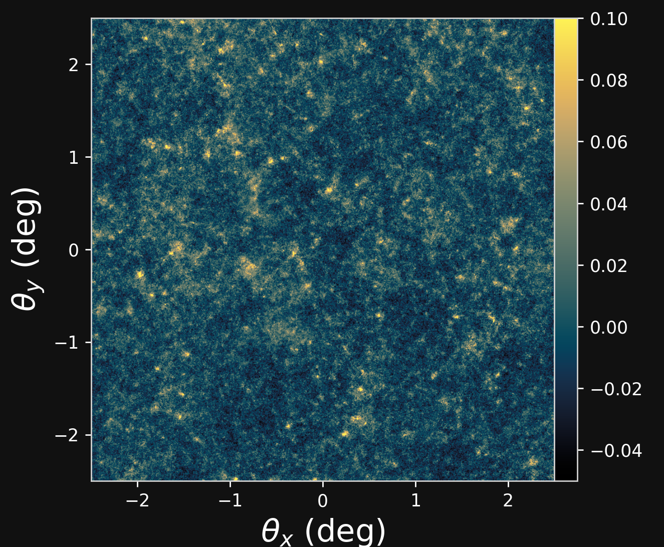 \[\begin{equation} \kappa_{born}(\boldsymbol{\theta},\chi_s)= \frac{3H_0^2 \Omega_m}{2c^2} \int_0^{\chi_s} d\chi \frac{\chi}{a(\chi)} W(\chi,\chi_s) \delta(\chi \boldsymbol{\theta},\chi). \end{equation} \]